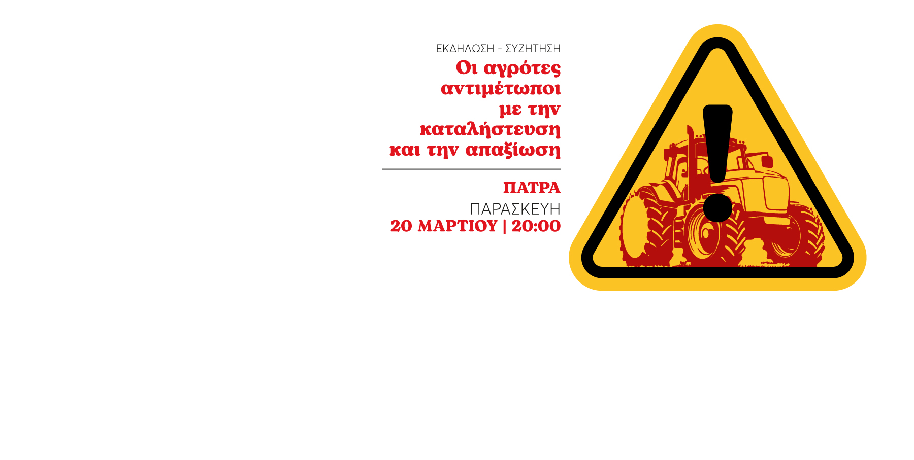 Εκδήλωση – Συζήτηση «Οι αγρότες αντιμέτωποι με την καταλήστευση και την απαξίωση» | Παρασκευή 20 Μαρτίου στην Πάτρα